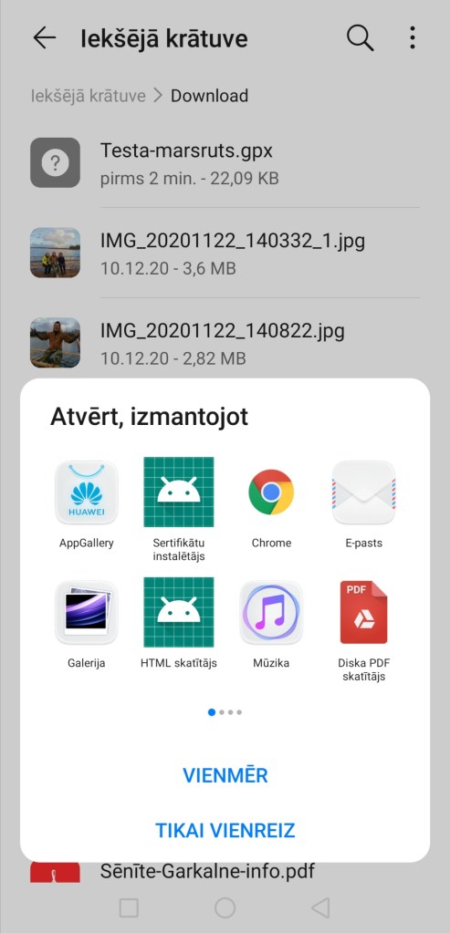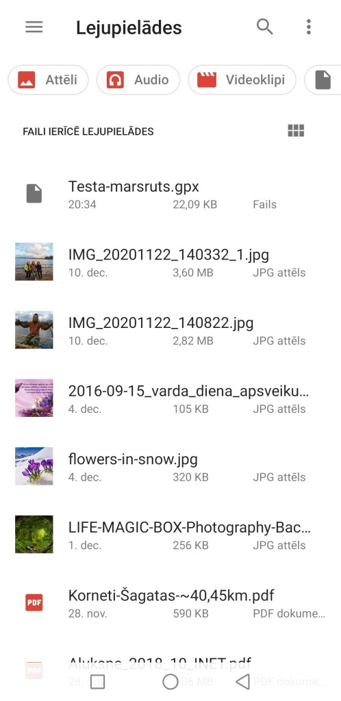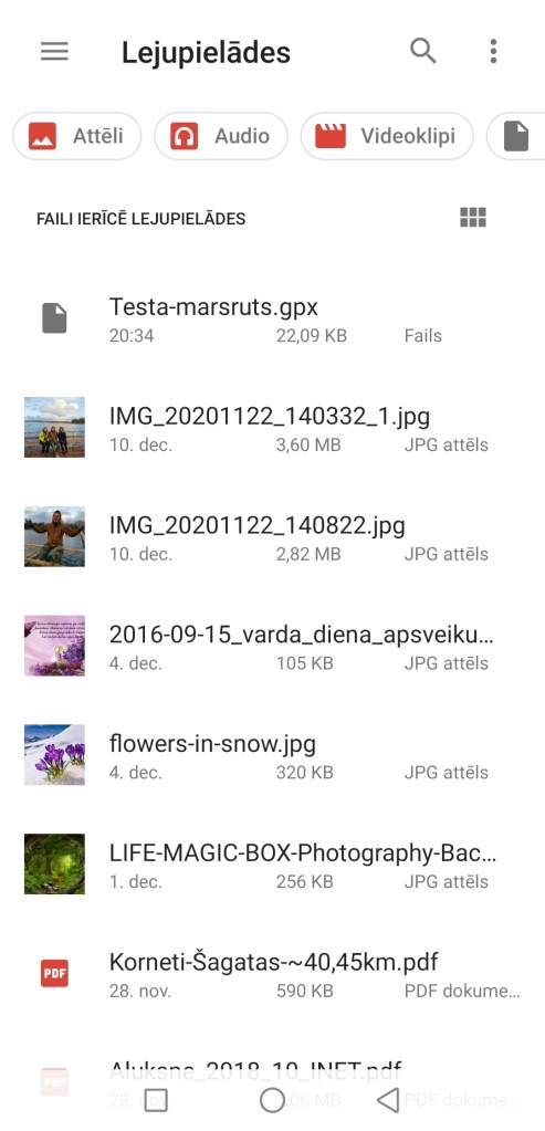 1) Savā viedtālrunī atrodiet vietu, kur glabājas lejuplādētais gpx fails “Testa-marsruts”. Manā viedtālrunī tas ir Faili > Iekšējā krātuve > Download (Lejupielādes), taču atšķirīgiem viedtālruņiem tas var atšķirties.