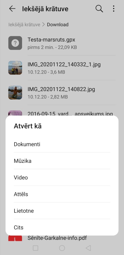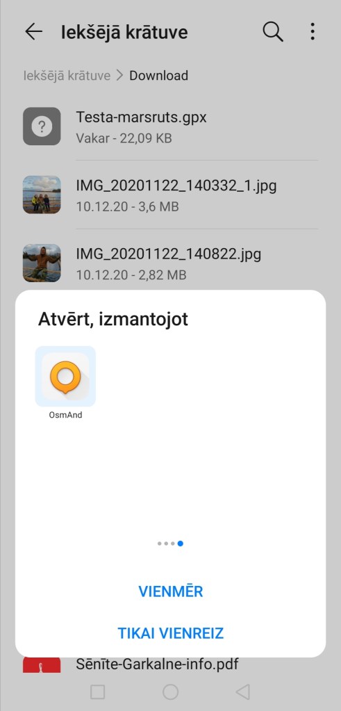 Manā gadījumā pēc noklusējuma aplikācija mani aizveda uz “Lejupielādes”, kur tieši glabājas fails “Testa-marsruts.gpx”. Ja aplikācija jūs aizved uz kādu telefona vietu, kur nav nepieciešamais gpx fails, tad meklējiet, kur tieši jūsu telefonā šis fails ir saglabāts. Kad atrodat, spiediet uz faila nosaukumu “Testa-marsruts.gpx”. Ar šo soli gpx fails tiek atvērts OsmAnd aplikācijā.