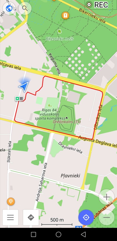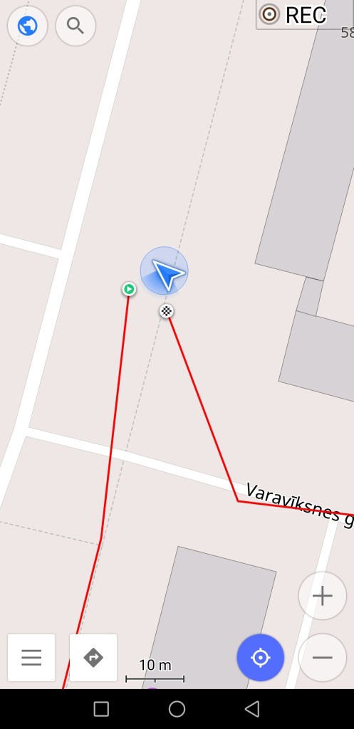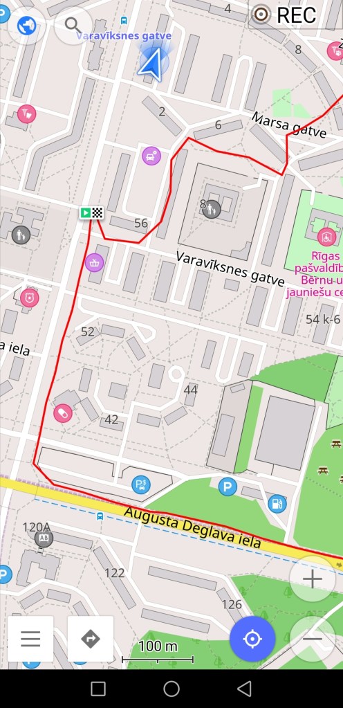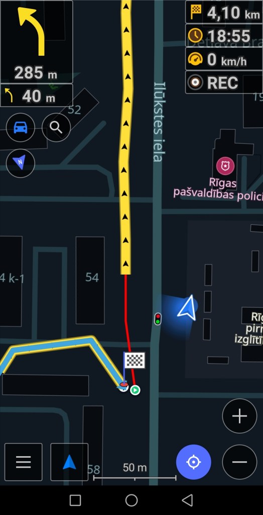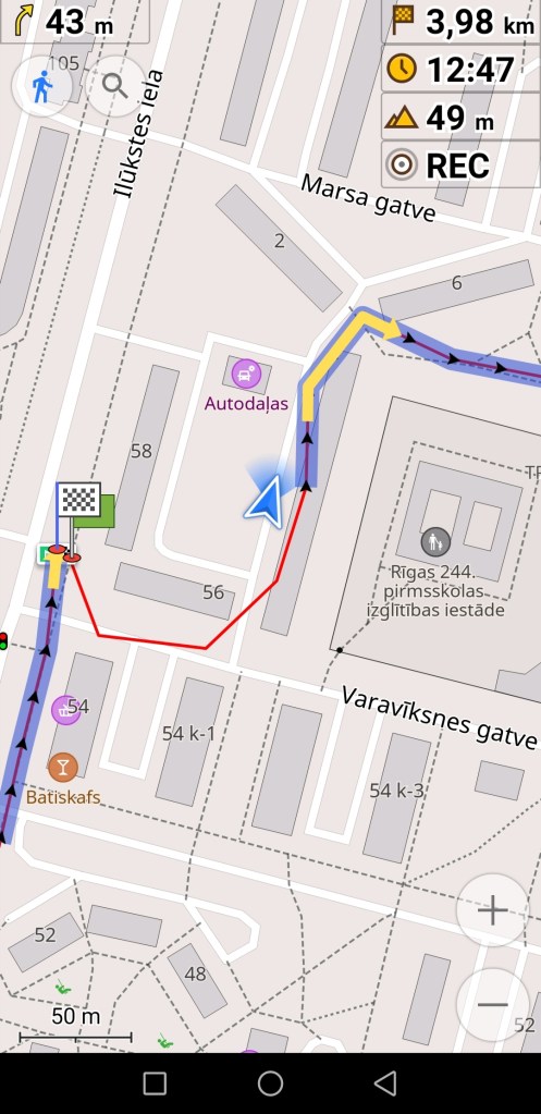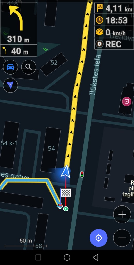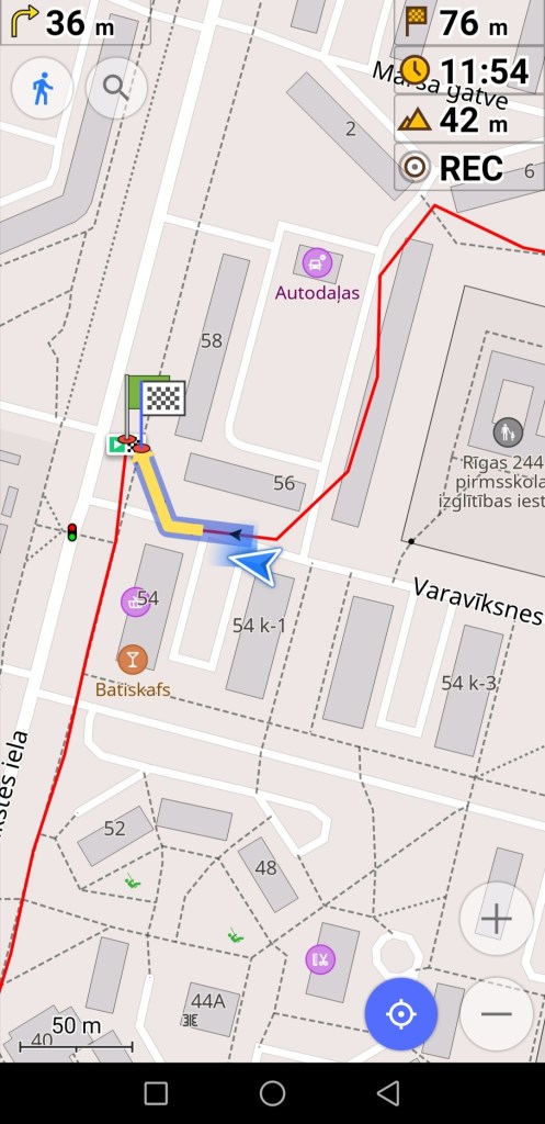 Attēlā uz gaiši pelēkā fona ir navigācijas attēlojums kājāmgājēja režīmā. Šajā gadījumā, lai kādā virzienā jūs grieztos, aplikācijā karte paliks statiska – negriezīsies līdzi jūsu kustības virzienam. Attēlā uz tumši pelēkā fona ir navigācijas attēlojums auto braukšanās režīmā. Šajā gadījumā aplikācijā karte kustēsies līdzi jūsu kustības virzienam (tieši tāpat kā navigācija aplikācijā Waze). Attēlos dažus metrus jau esmu pagājusi pa maršrutu, tur līnija palikusi sarkana. Kājāmgājēja maršrutā var redzēt, ka mana atrašanās vieta nav tieši uz līnijas, taču aplikācija uzskata, ka to posmu tieši tur blakus esmu nogājusi. Kā rakstīju iepriekš, gan jūsu atrašanās vietai, gan maršrutam var būt dažu metru kļūda. Šajā gadījumā maršruta līnija pat ir nedaudz virs daudzdzīvokļu mājas, kas nav loģiski. Vizuālam piemēram ir nākamais attēls, kur var redzēt, kas notiek, ja atrodaties jau tālāk no maršruta.