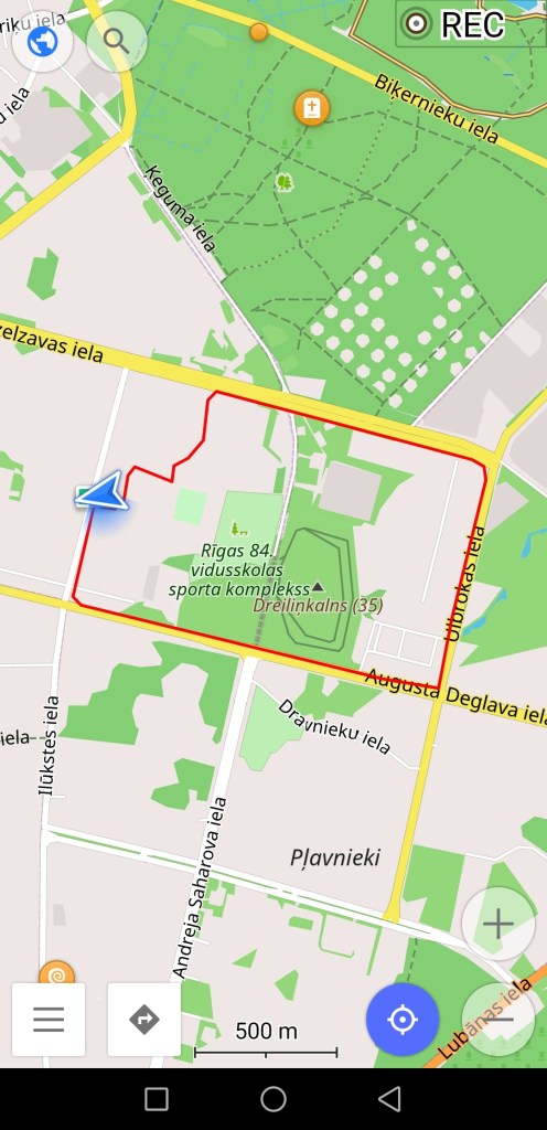 1) Pieļauju, ka šis ir vissaprotamākais veids, visvieglāk uztveramais, īpaši atrodoties dabā. Taču katram uztveres īpatnības var atšķirties. Pēc faila atvēršanas aplikācijā un maršruta ieraudzīšanas pilnekrāna kartē vienkārši pietuviniet un attāliniet karti tā, kā jums ir nepieciešams. Jo vairāk pietuvināsiet karti, jo detalizētāka tā kļūs, var parādīties arī sīkākas taciņas, kas attālinātā variantā nebija redzamas. Jūs redzat savu atrašanās vietu ar zilu bultiņu un redzat maršrutu ar sarkanu līniju. Vienkārši tuvojieties maršrutam un vienā punktā sāciet iet pa maršrutu. Ik pa brīdim jums būs jāieskatās aplikācijā, lai pārbaudītu, vai vēl esat uz maršruta. Apļveida maršruta gadījumā varat sākt jebkurā maršruta vietā.