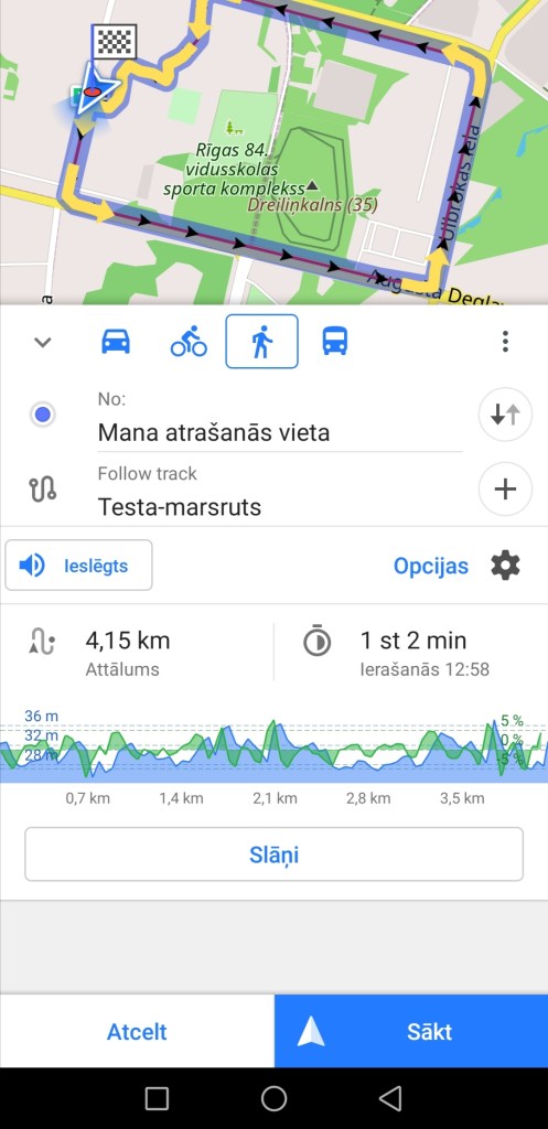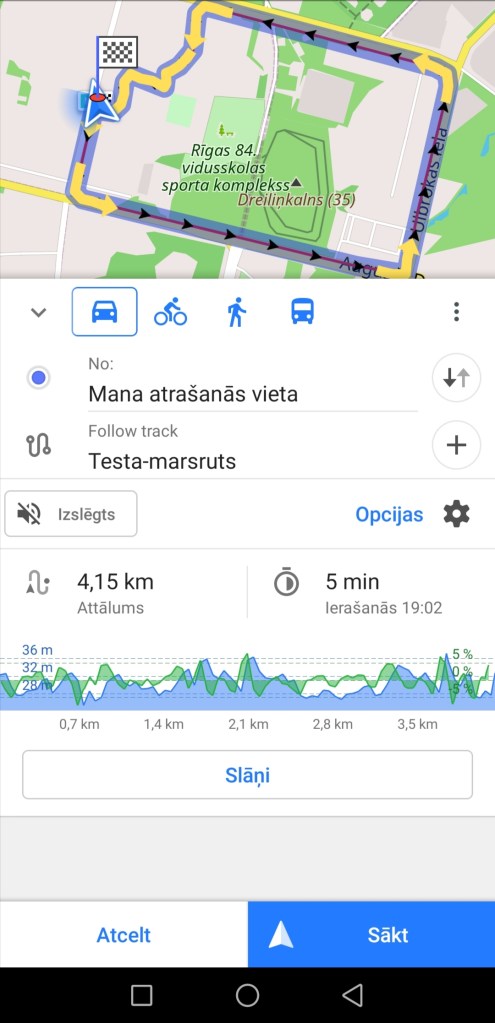 Ar šo darbību jūs atgriežaties vispārējā navigācijas iestatījumu logā. Kad vēlaties sākt navigāciju spiediet uz “Sākt” labajā apakšējā stūrī. Šo darbību varat veikt arī bez maršruta virziena maiņas. Un tad atveras navigācija, kas var izskatīties atšķirīgi – uz gaišāka vai tumšāka fona, atkarīgs, kādu pārvietošanās veidu izvēlējāties. Ja jūsu atrašanās vieta būs tā tālāk no maršruta sākuma punkta, tad aplikācija vispirms centīsies jūs aizvest līdz maršruta sākuma punktam.