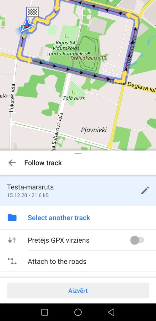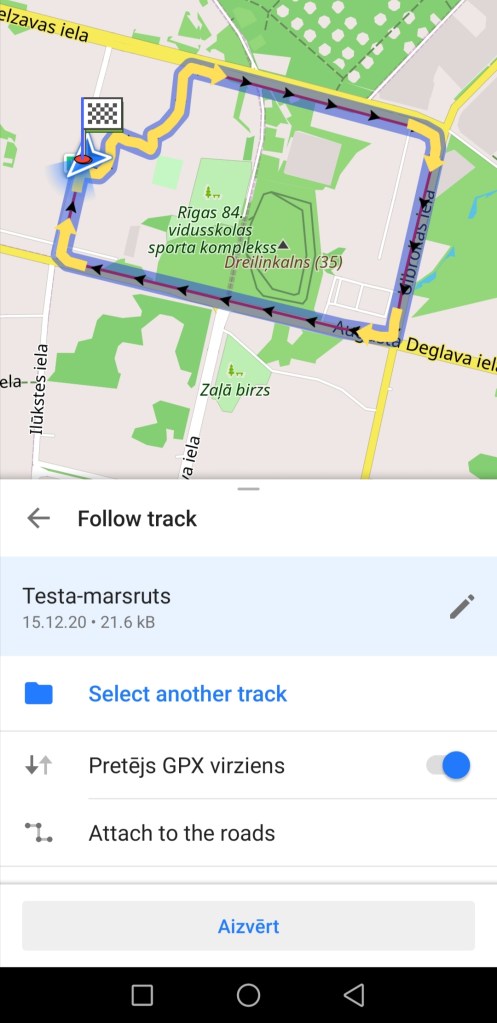 Pietuviniet karti uz to maršruta vietu, kur redzams maršruta sākums un beigas. Abi apzīmēti ar aplīšiem. Vienā ir balta bultiņa uz zaļa fona (pēc noklusējuma maršruta sākums), otrā ir melni balts rūtojums (pēc noklusējuma maršruta beigas). Iesaku aiziet pēc iespējas tuvāk maršruta sākuma punktam. Tā, kā parādīts šajā attēlā, ir pilnīgi pietiekami.