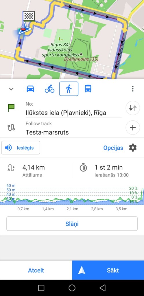 Tagad parādās, ka es izvēlējos kājāmgājēju un ieslēdzu navigācijas skaņu (abas ikonas ir zilas). Pēc noklusējuma aplikācija rādīs maršruta bultiņas tajā virzienā, kā orģinālais gpx fails ir radīts, respektīvi, no sākuma uz beigām. Ja vēlaties, lai navigācija jūs ved pretējā virzienā, tad šajā pašā logā nospiediet uz “Opcijas” – tieši pretī skaņas simbolam. Atvērsies jauns logs.