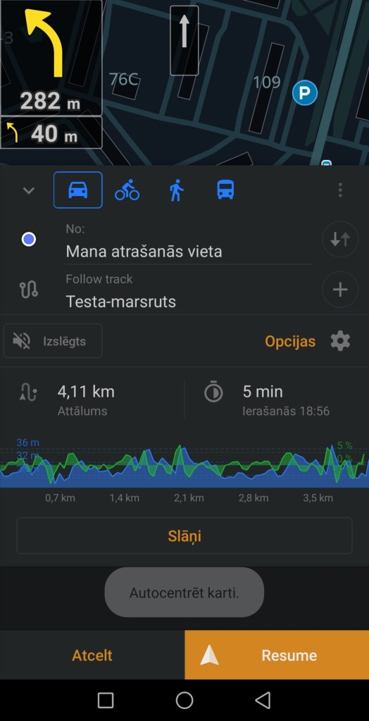 Šajā logā spiediet uz “Atcelt”, kas atrodas apakšpusē. Ja tomēr gribat palikt navigācijas skatā, tad spiediet uz “Resume”. Šoreiz es nospiedu uz “Atcelt”, un aplikācija man pārjautā, vai es tiešām vēlos apturēt navigāciju.