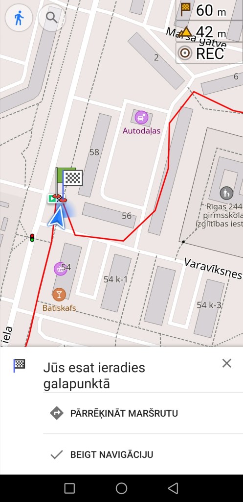 Vizuāli tā īsti jau nekas nav noticis, vienkārši jūsu atrašanās vieta (zilā bultiņa) vairs nav uz līnijas vai blakus tai. Ja navigācijai neesat ieslēdzis skaņu, tad tas nozīmē, ka arī šajā veidā jums ik pa brīdim ir jāieskatās navigācijā, lai saprastu, vai neesat novirzījies no maršruta un tam vēl sekojat. Ja navigācijai esat ieslēdzis skaņu, tad jūsu izvēlētajā valodā aplikācija jums ziņos, ka esat pārāk tālu no maršruta, kā arī stāstīs, kad jums ir jāpagriežas.